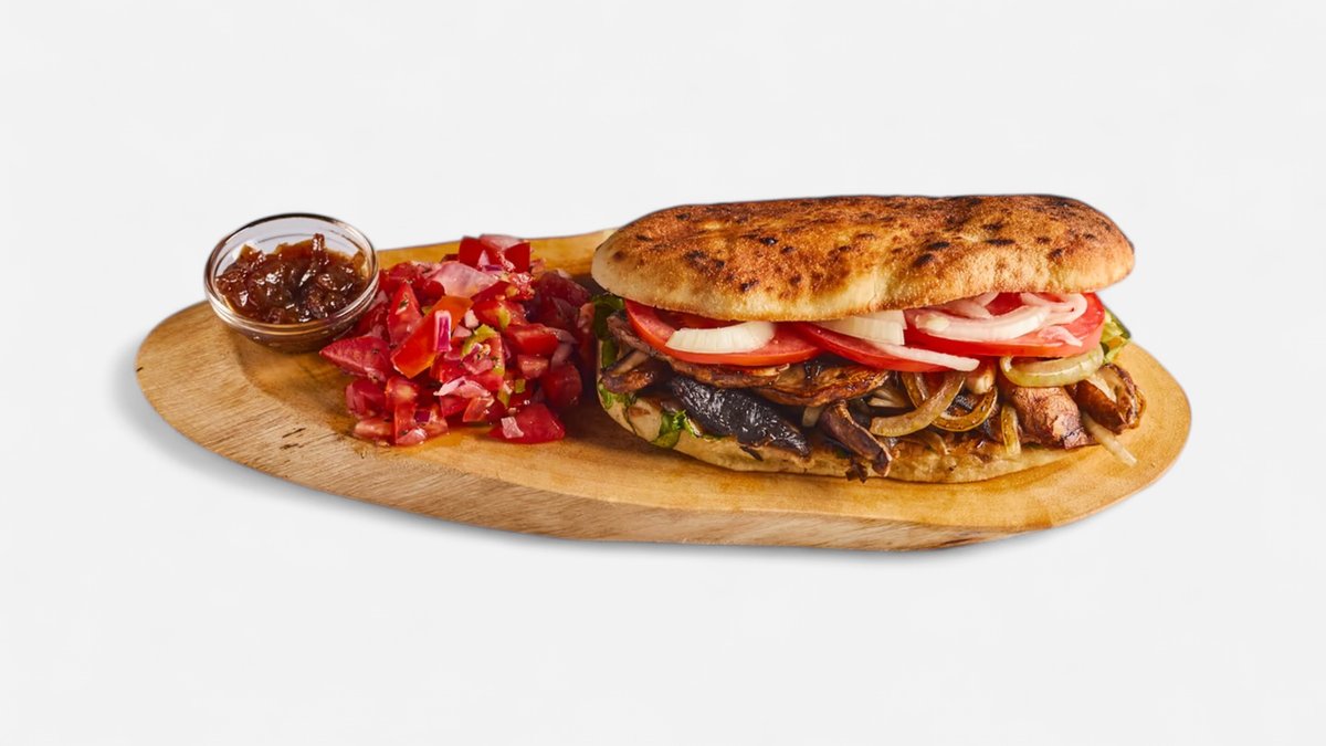 רצועות פורטובלו עסיסיות, מושרות במרינדה ביתית במתכון ייחודי, מוקפצות עם בצל מטוגן בלחם פרנה עבודת יד עם צ׳ימיצ׳ורי, חסה, עגבנייה, בצל חי וצ׳ילי מתוק