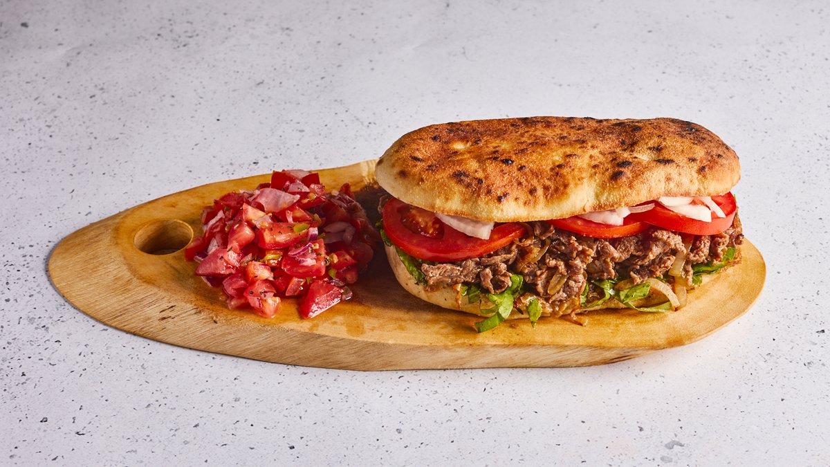 נתחי אסאדו ארגנטינאי הנצלים על הפלנצ'ה ומטוגנים ביחד עם בצל, מלח ופלפל בלחמניית מיני פרנה בעבודת יד עם ירקות טריים ורטבים לבחירה
