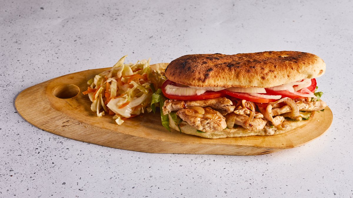רצועות פילה עוף עסיסי צלוי על הפלנצ'ה עם בצל מטוגן מתובל במעט רוטב סויה מוגש בלחם פרנה עבודת יד, ירקות טריים ורטבים לבחירה.
