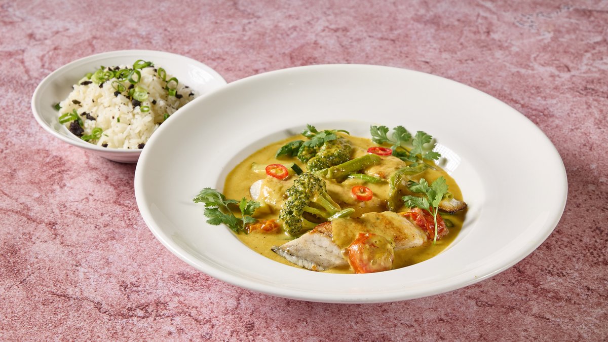 חלב קוקוס, צ'ילי, ג'ינג'ר,למון גראס, כפיר ליים, ירוקים ואורז לבן. טבעוני