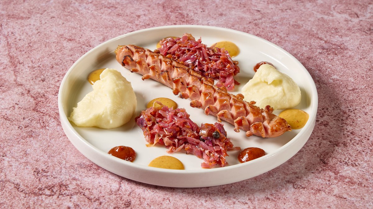 נקניקיית עוף צלויה, כרוב שוקרוט, פירה וברביקיו מעושן