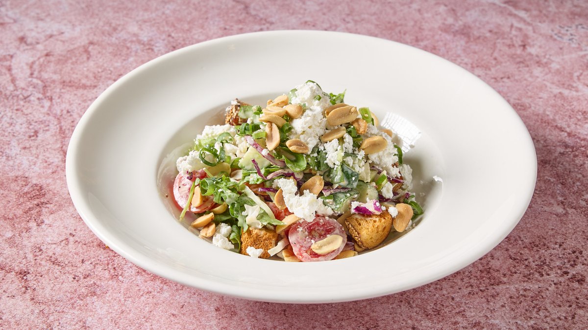 עגבניות, כרוב סגול, מלפפון, עלי רוקט, קרוטונים, בוטנים, רוטב ויניגרט חרדל וגבינת פטה
