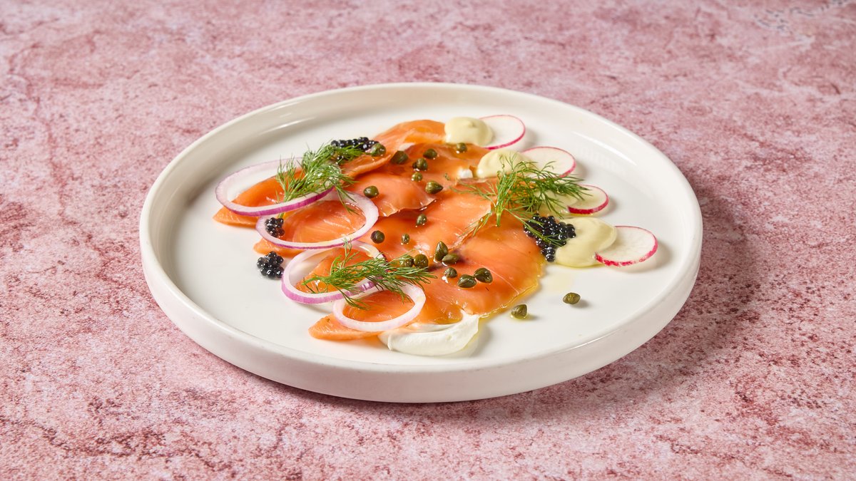 סלמון כבוש על קרם פרש, בצלים, שמיר, צנוניות , פניני קוויאר שחור ואיולי וואסבי