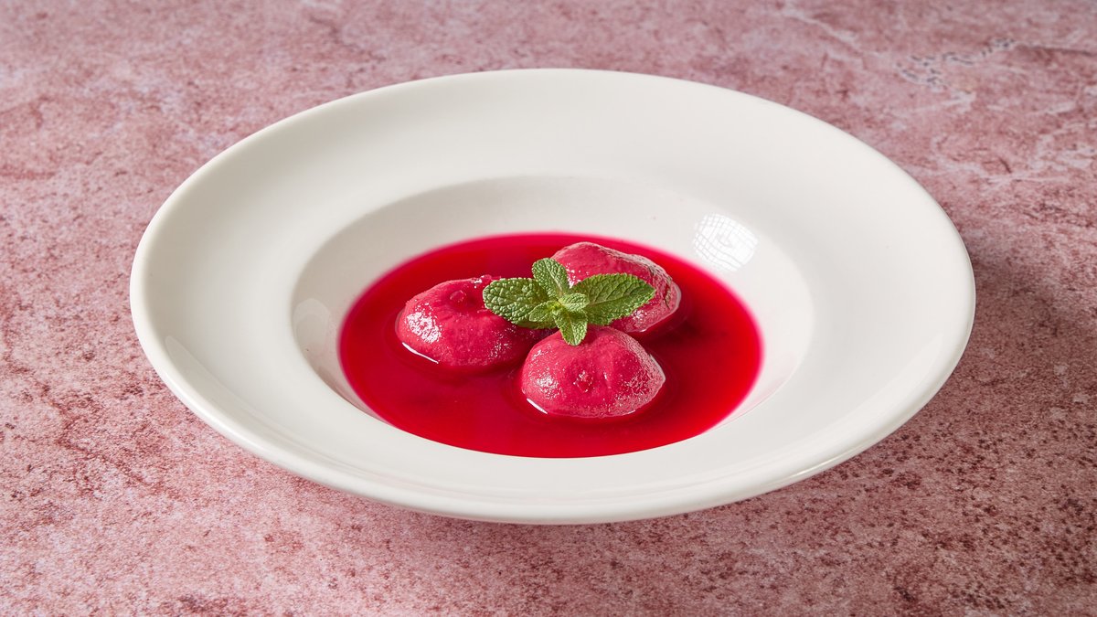 כדורי סולת במילוי בשר טלה, צנוברים ונענע במרק סלק ונענע - חמוץ מתוק