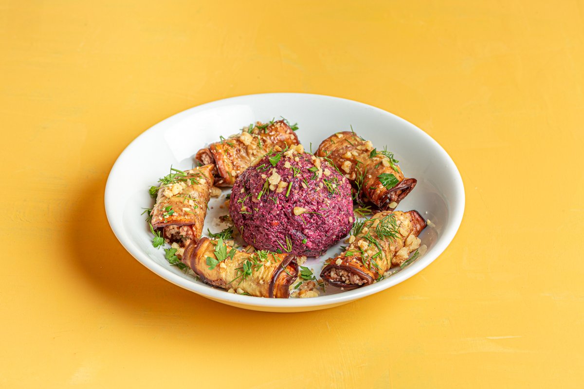 גלילים של חציל במילוי תערובת אגוזי מלך ופחאלי של סלק אדום