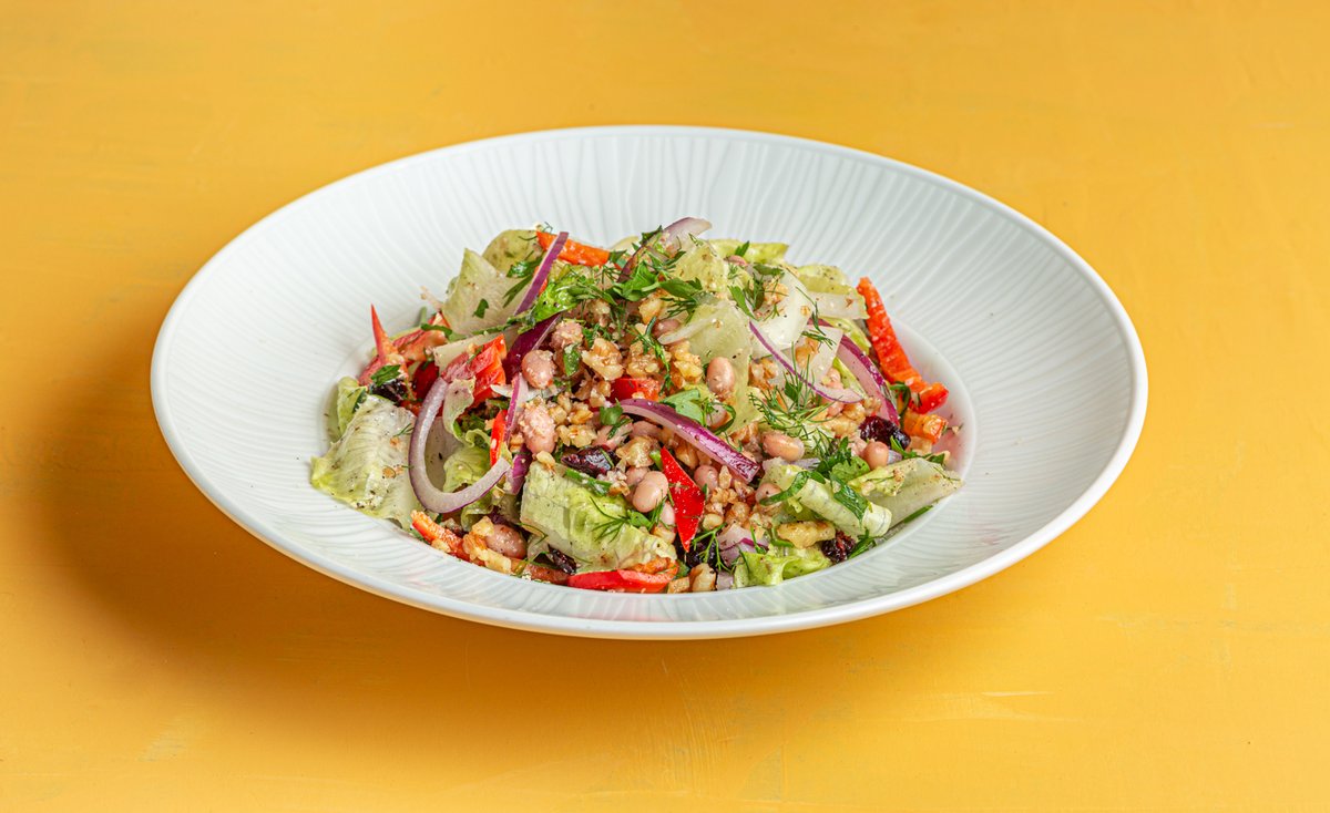 חסה, גמבה, בצל סגול, שעועית לבנה, אגוזי מלך, חמוציות וירק בתיבול גאורגי מקורי
