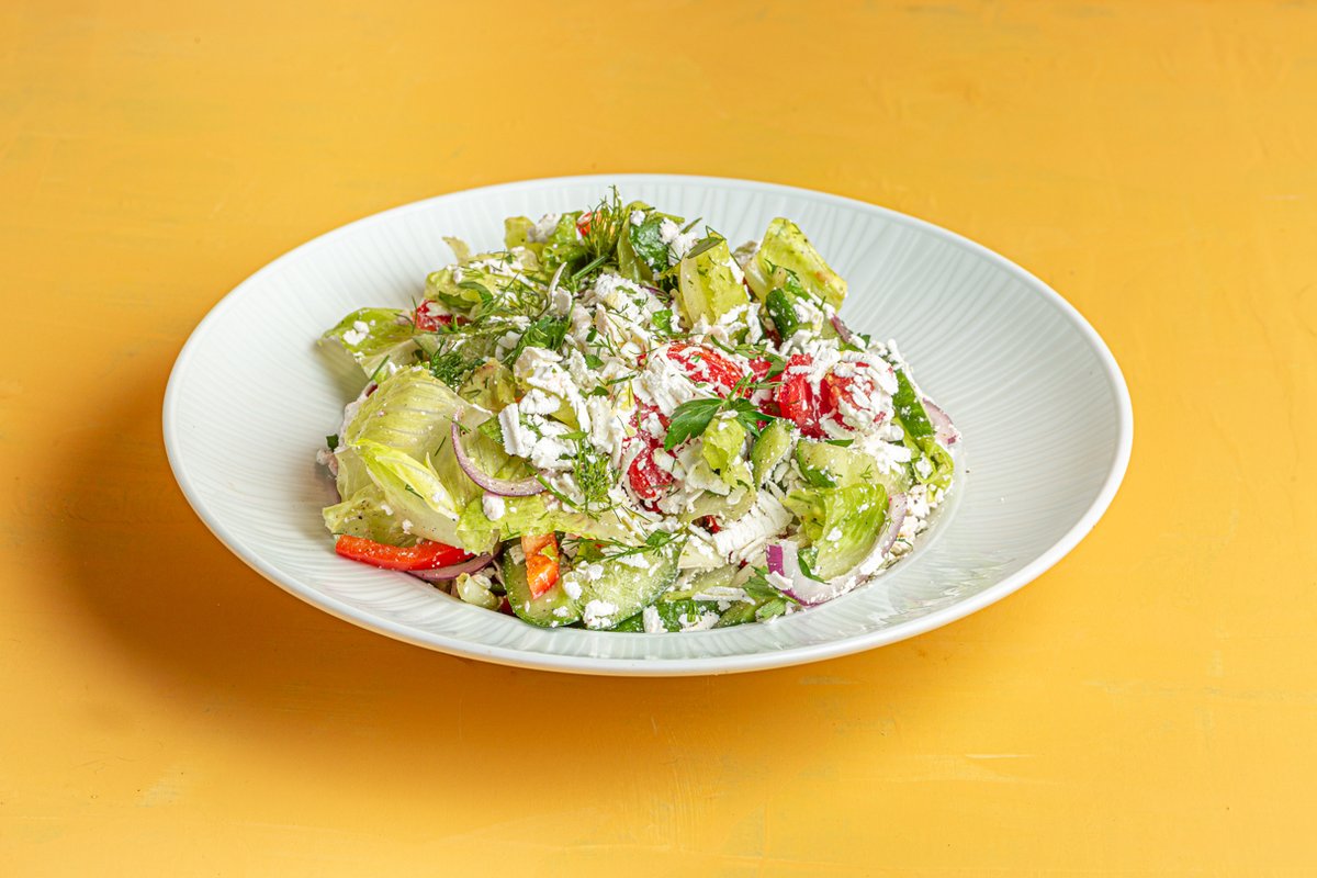 מלפפון עגבניה, בצל סגול, גמבה, חסה וירק בתיבול שמן זית, מיץ לימון וגבינה בולגרית