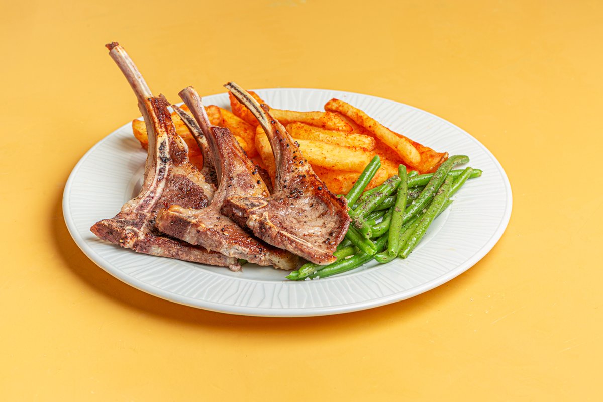 צלעות טלה מובחרות על הגריל לצד תפוח אדמה אפוי ושעועית ירוקה