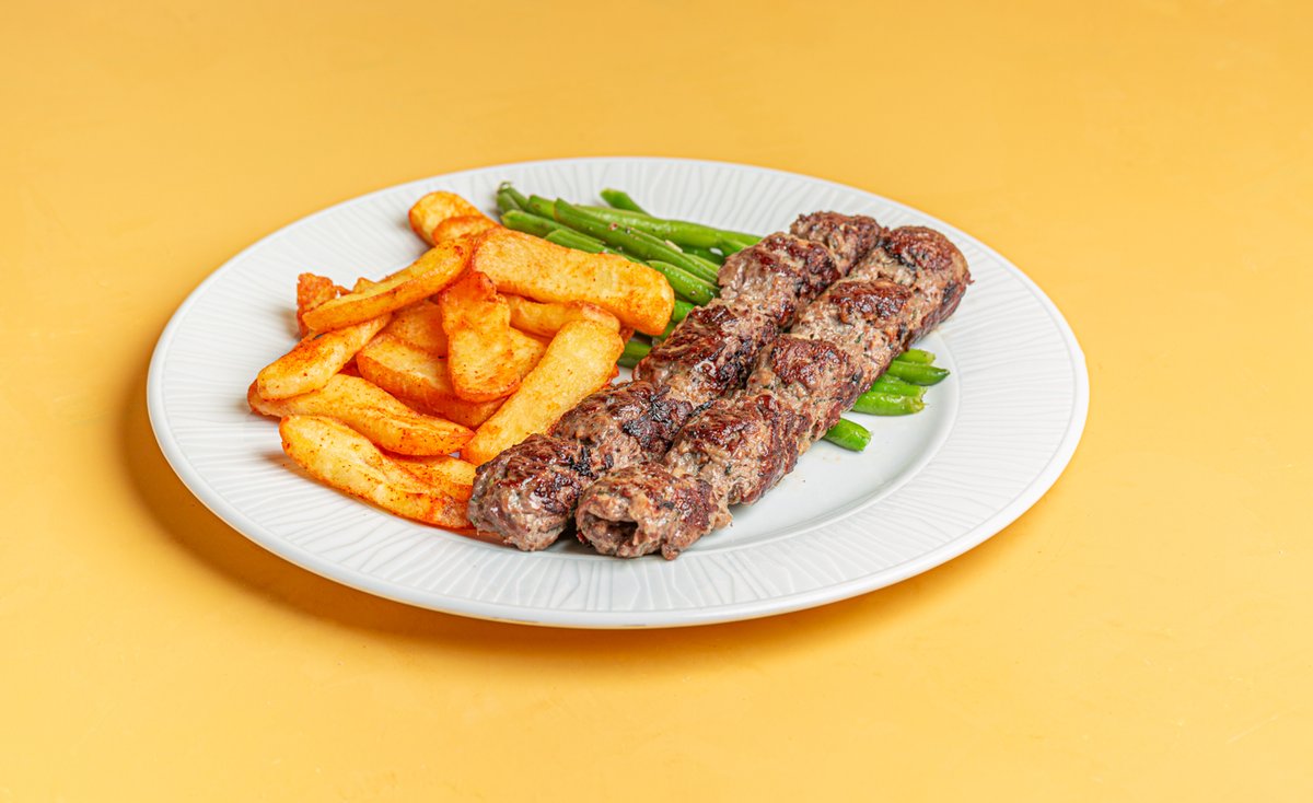 קבב מקורי מהמטבח הגאורגי בליווי צ'יפס ושעועית ירוקה
