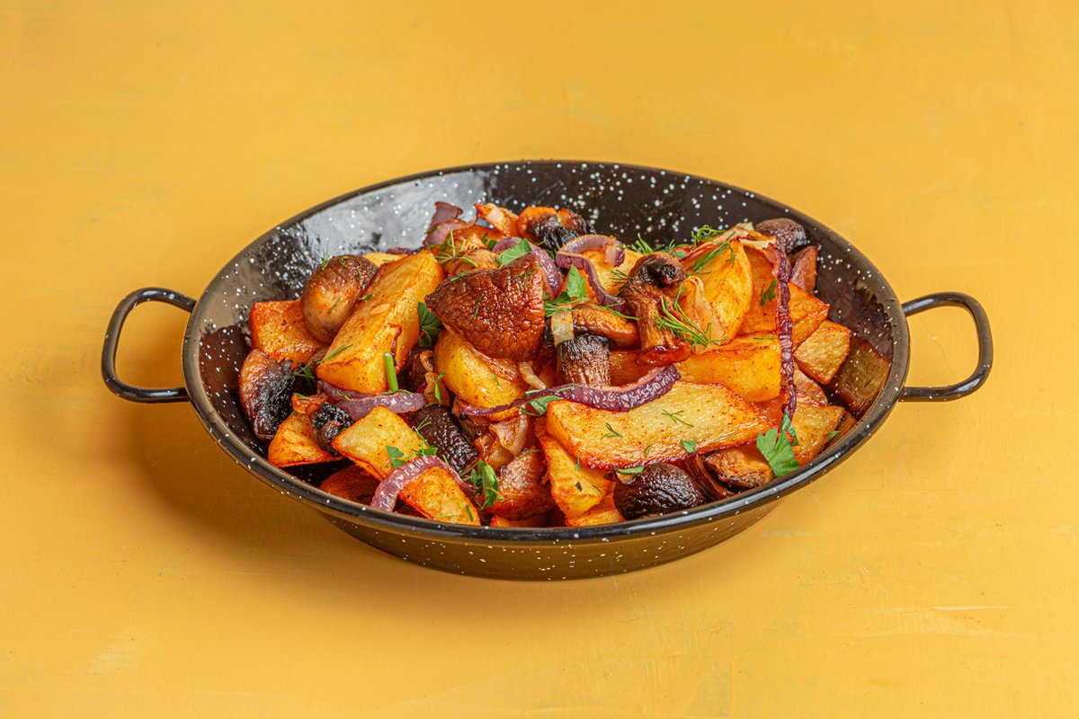 תפוחי אדמה, פטריות ובצל סגול מוקפצים יחד בתיבול מקורי