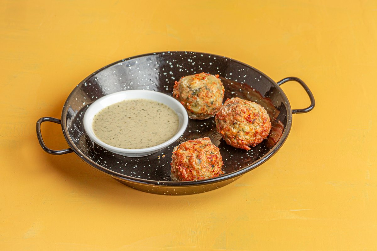כדורי גבינה פריכים עם נגיעות של נענע ושום שמיר, מגיע בליווי מטבל מקורי (3 יח')