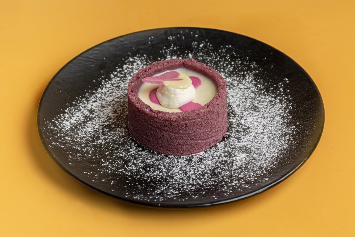 שכבות של עוגת אוכמניות ביתית, קרם גבינה "ונילי", קרם אוכמניות עדין, בציפוי גנאש שוקולד לבן.