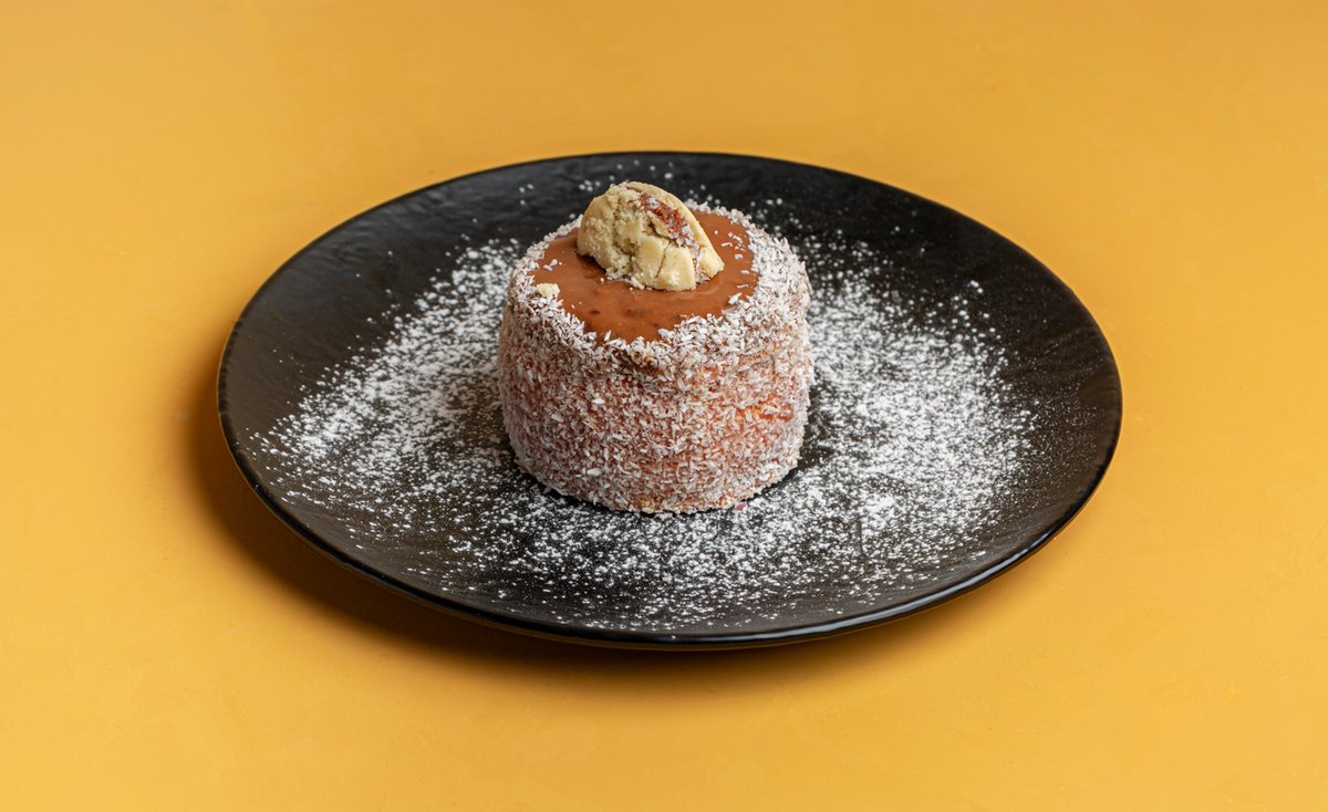 בסיס עוגיית אלפחורס גדולה, קרם ריבת חלב, ליבת קרם קוקוס, דקואז קוקוס, בציפוי גלאסז' קרמל ובעיטור קוקוס לבן וחצאי עוגיות אלפחורס.