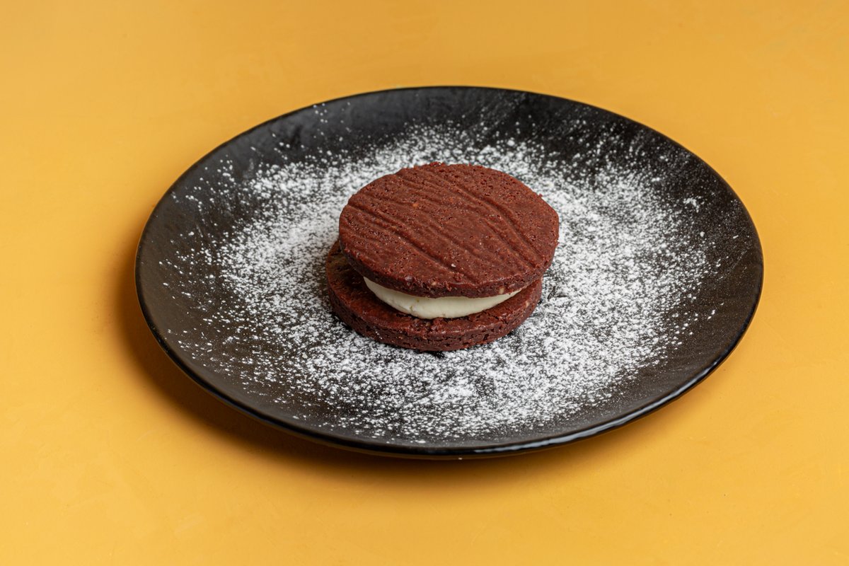 שתי שכבות של עוגיית בראוניס, קרם מסקרפונה עשיר בציפוי של שוקולד גנאש מריר.