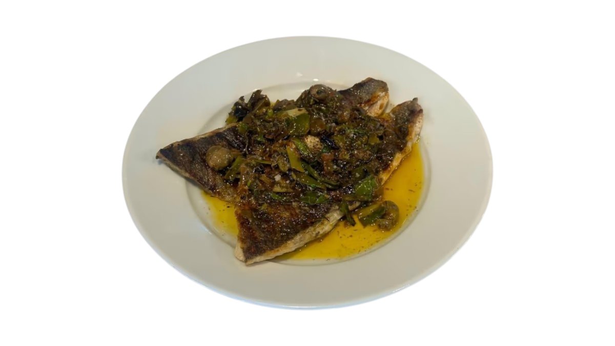 דג ים, ציר דגים וירקות שורש, לחם צלוי ושום 150 גרם דג.