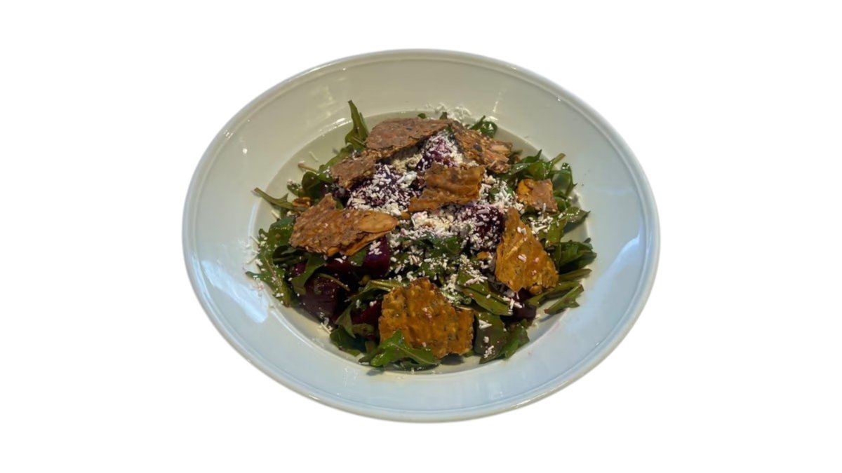סלק, שום, טחינה, עלי רוקט, בצל ולימון. צמחוני.
