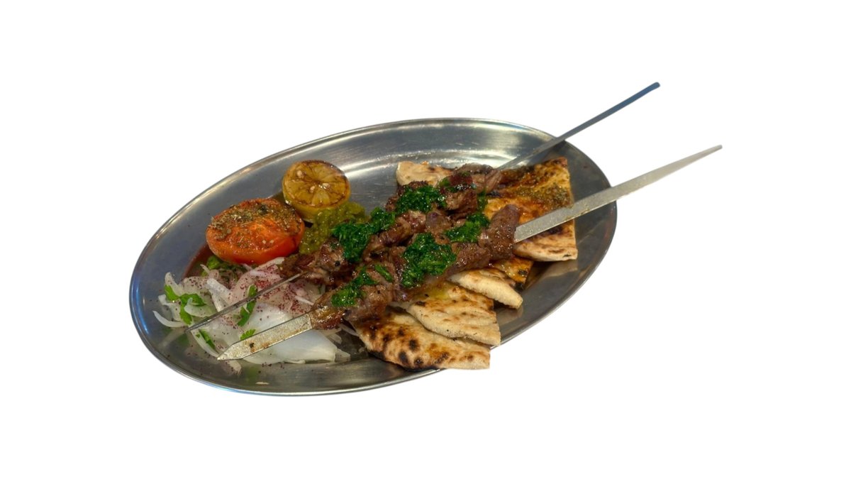 קבב בקר ושומן טלה, פיתה יוונית בשמן זית ואורגנו, בצל, סומק, פטרוזיליה, עגבניה בגריל, טחינה ורליש שפקה ירוקה
