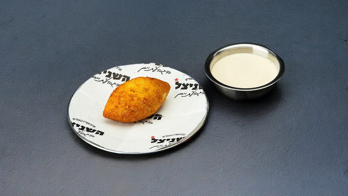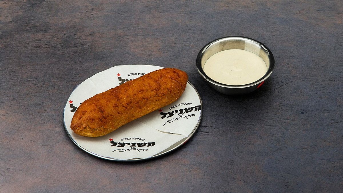 שניצל של האטליז, חומוס, טחינה, חציל, עמבה, פלפל חריף על הגריל ומטבוחה מוגש עם צ׳יפס, שתייה ורוטב לבחירה