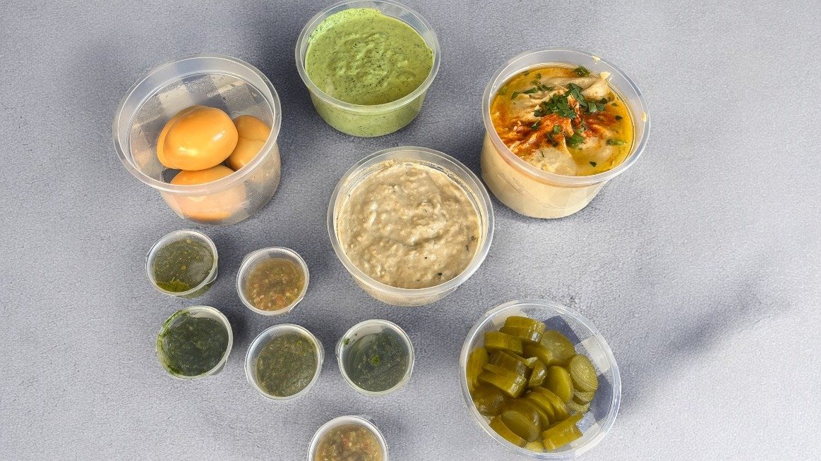 חצי קילו חומוס, רבע קילו טחינה ירוקה, רבע קילו ממרח חצילים קלויים, 4 ביצים חומות, קופסת חמוצים ו-2 סטים של רטבים