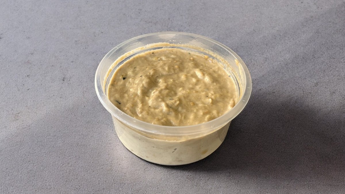חומוס מעורבב עם גרגירים, טחינה גולמית, שום, לימון, שמן זית, פפריקה ופטרוזיליה