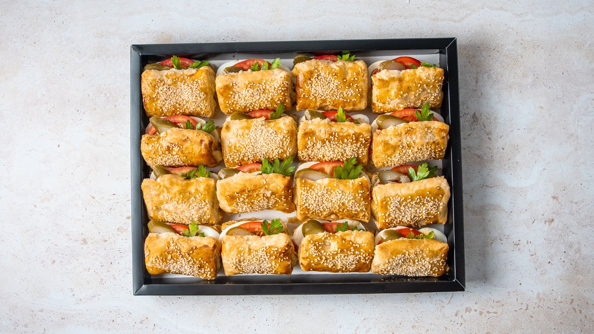 בורקס עם טחינה, ביצה, עגבניה, חמוץ ועלי רוקט | 15 יחידות