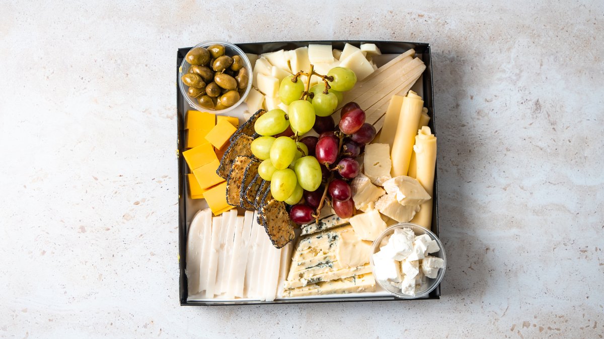 גאודה, בולגרית מעודנת, גבינת סנט מור, קממבר, עגבניות שרי וענבים
