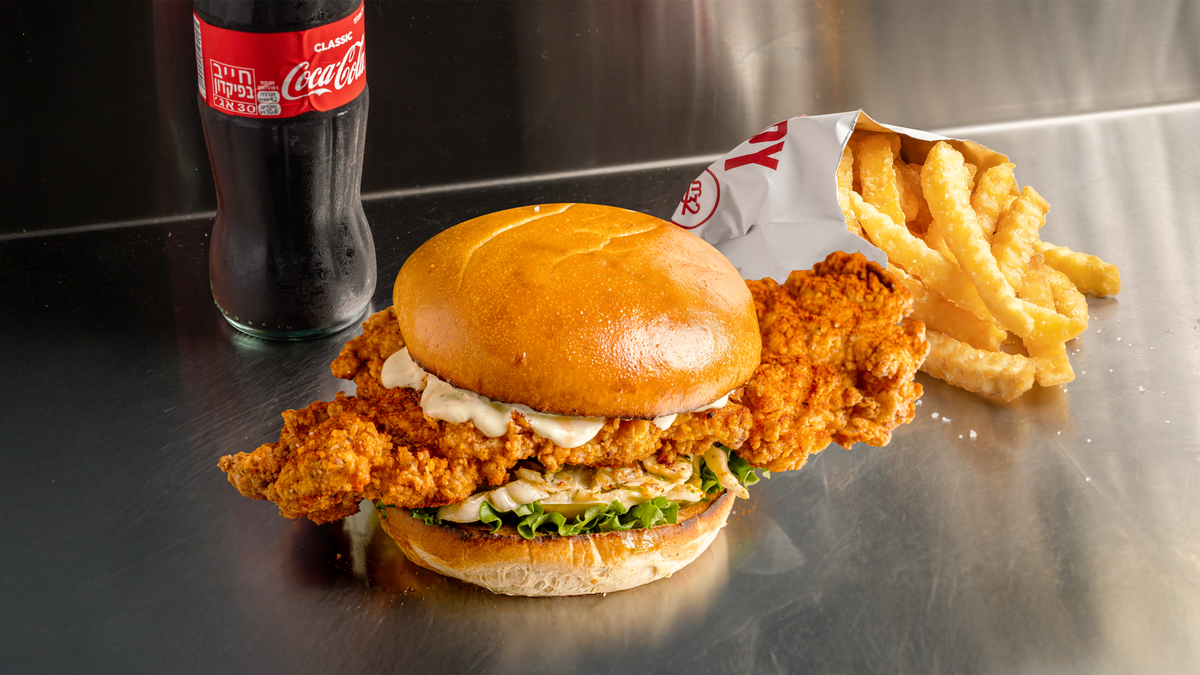 עוף פריך ועסיסי בלחמנייה רכה, רוטב ראנץ (חלבי), חסה לאליק, בצל כבוש, חמוצים וכרוב סריראצ'ה. *המנה פיקנטית, מכילה גלוטן. בהוצאת רוטב הראנץ המנה אינה מכילה חלב.