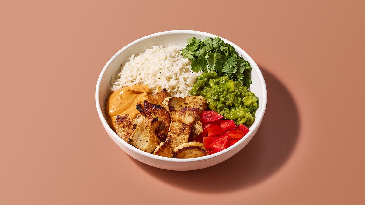 נתחי חזה עוף צרובים על הפלנצ׳ה על אורז, אבוקדו, עגבניות, כוסברה ומטבל בצד לבחירה