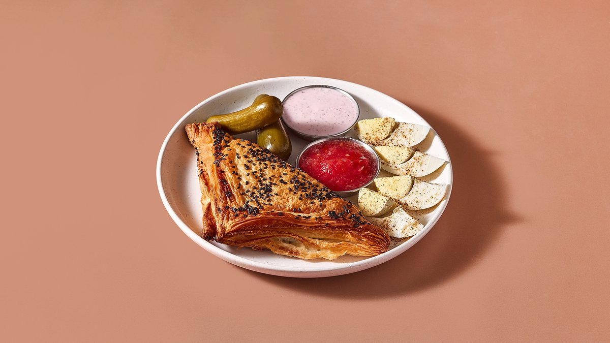 בורקס גבינה עם נגיעות תרד באפייה ביתית, ביצה קשה פרוסה, חמוצים פרוסים, רסק עגבניות ומטבל לבחירה