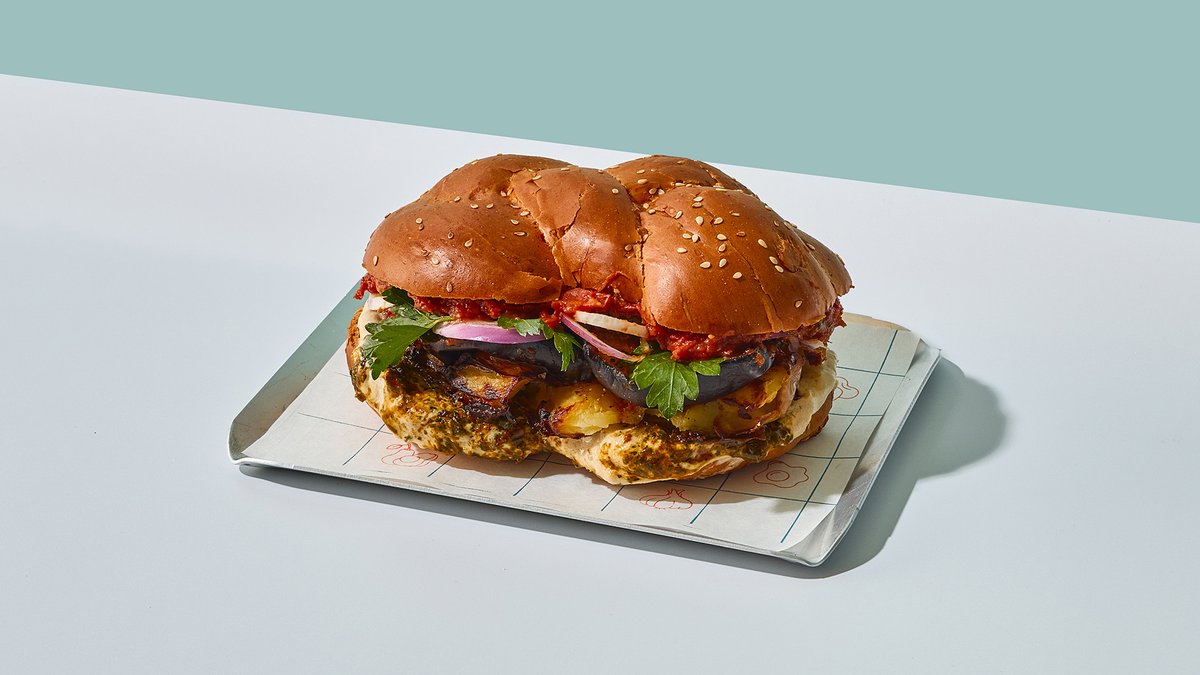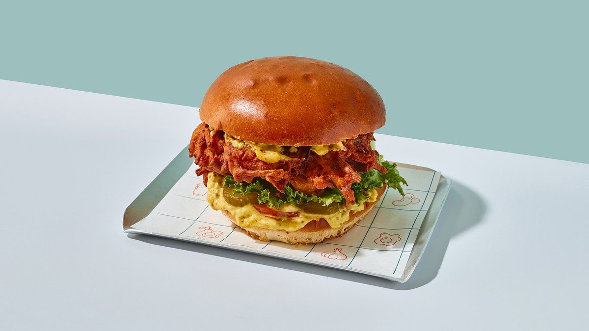 לחמניית המבורגרּ, איולי קארי ומייפל, כרישה מטוגנת בטמפורת חומוס, חמוצים, חסה ועגבניה