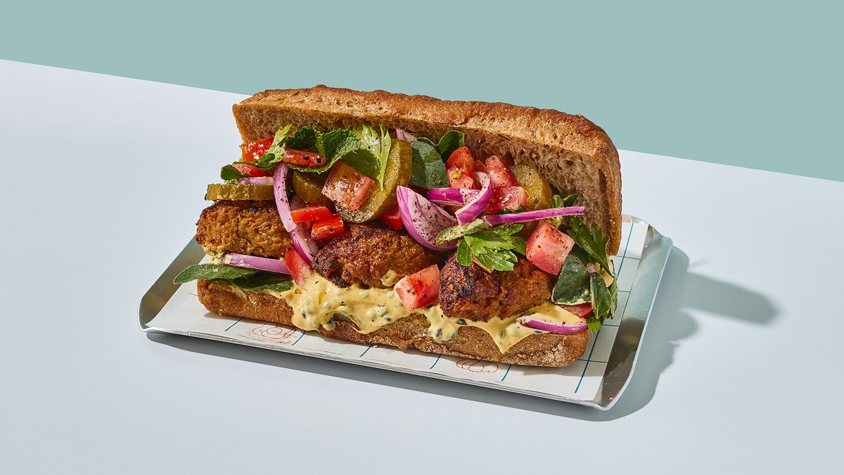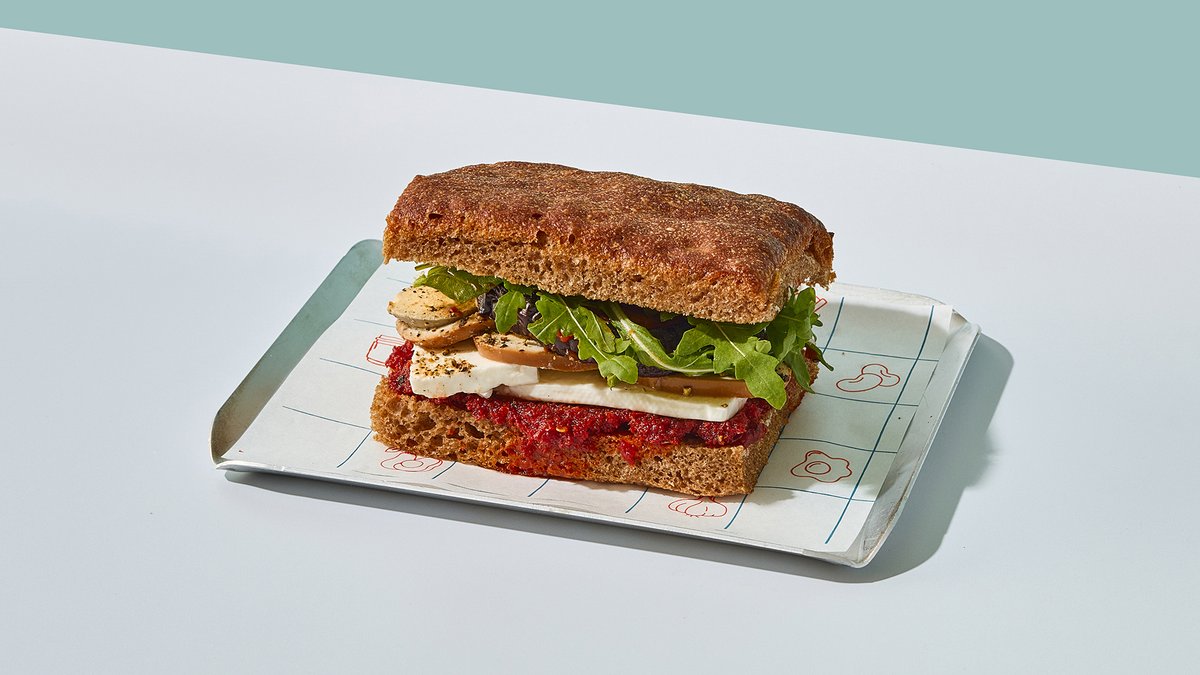 לחם כוסמין צ׳יה שאנחנו אופים במקום, חסות קיסר פריכות, קריספי טופו, ממרח איולי ארטישוק, ממרח עגבניות מיובשות, נגיעות של חרדל, צלפים ומלפפון חמוץ