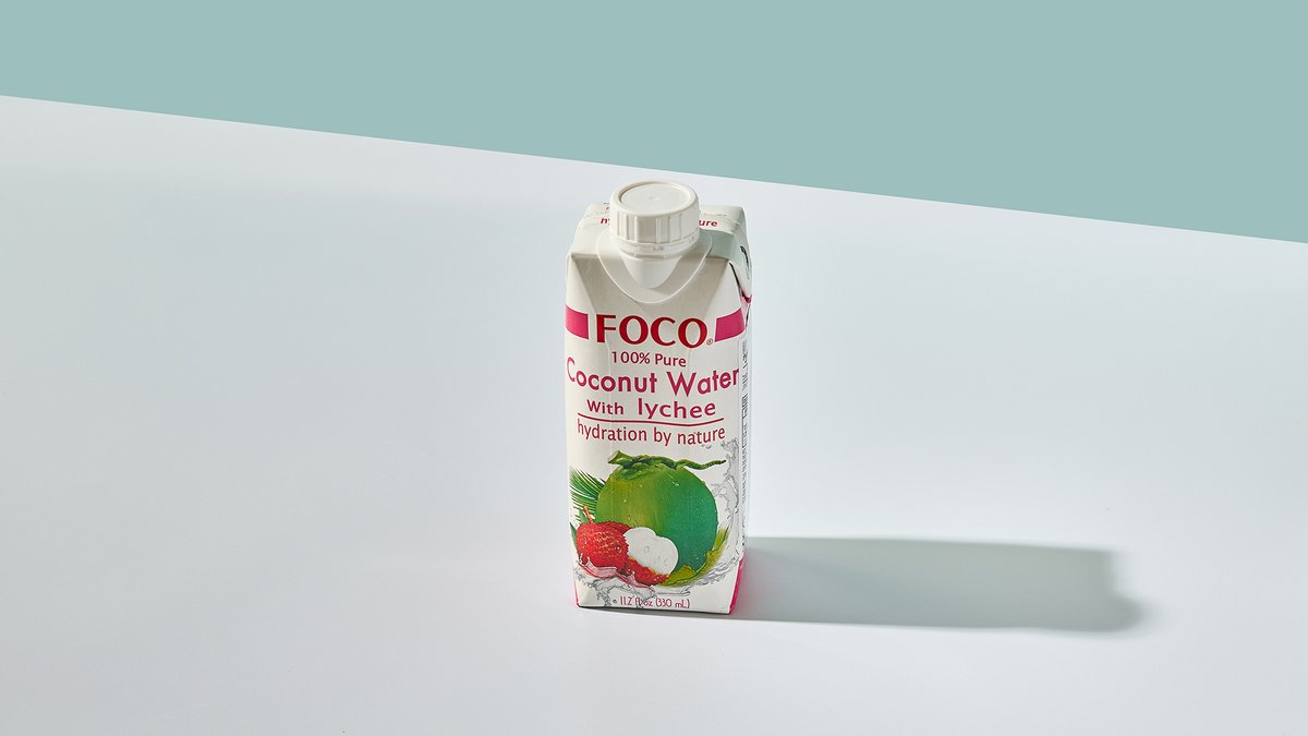 מי קוקוס פוקו בתוספת ליצ׳י, מיוצר מאגוזי קוקוס טריים, ללא חומרים משמרים וללא תוספות סוכר.