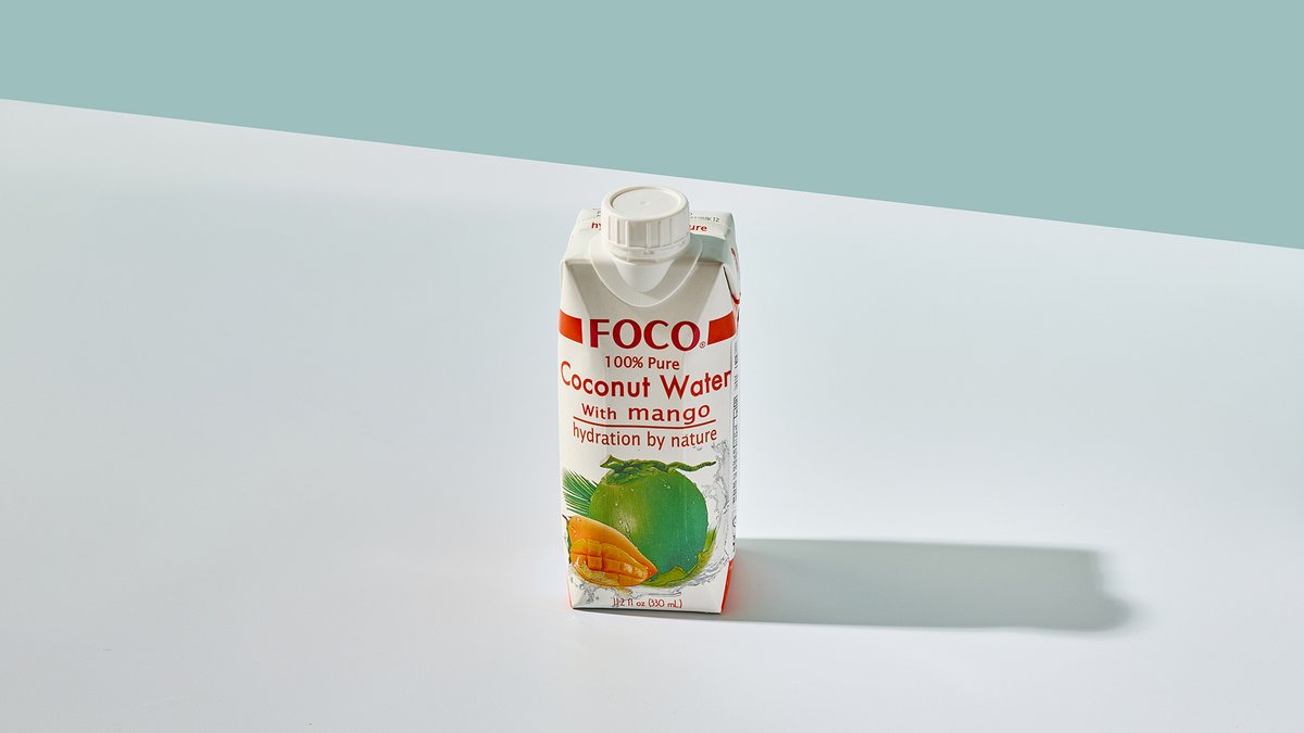 מי קוקוס פוקו בתוספת מנגו, מיוצר מאגוזי קוקוס טריים, ללא חומרים משמרים וללא תוספות סוכר