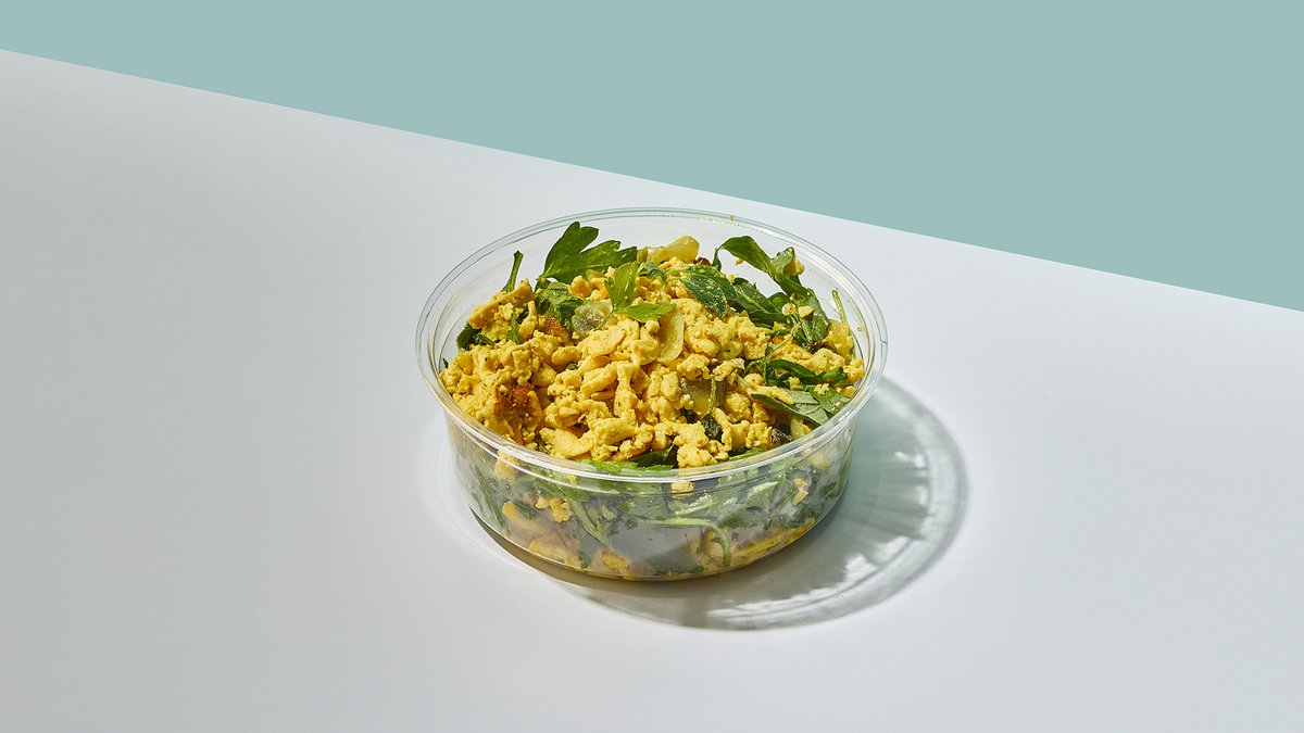 מקושקשת של טופו עם בצל מטוגן, עשבי תיבול ותבלינים