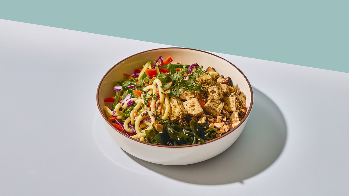 אטריות אודון, מלפפון, כרוב, גזר, טופו אסייתי בגריל, כוסברה, בוטנים, אצות וואקמה ונבטים מוגש עם רוטב מיסו לבן וג׳ינג׳ר לא ניתן לבצע שינויים במנה 🩵