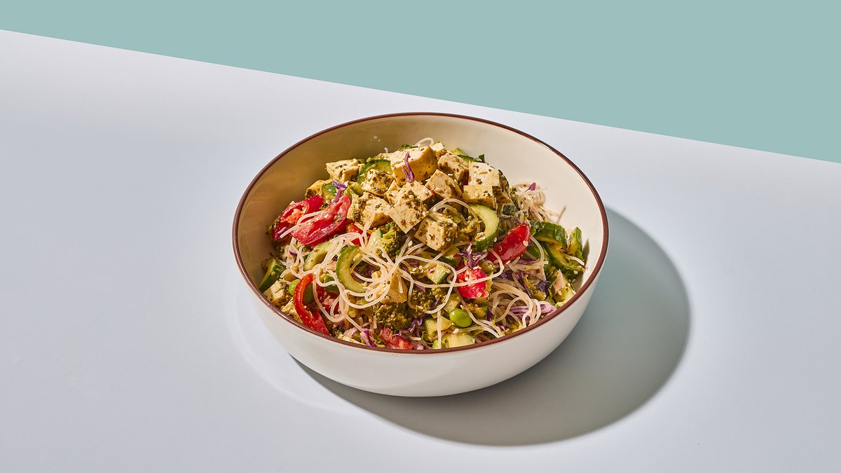 אטריות שעועית, רוטב בוטנים וג'ינג'ר, ברוקולי קצוץ, כרוב סגול, מלפפון, עגבניות שרי, אדממה, כוסברה, טופו תאילנדי, צ׳ילי אדום ושומשום