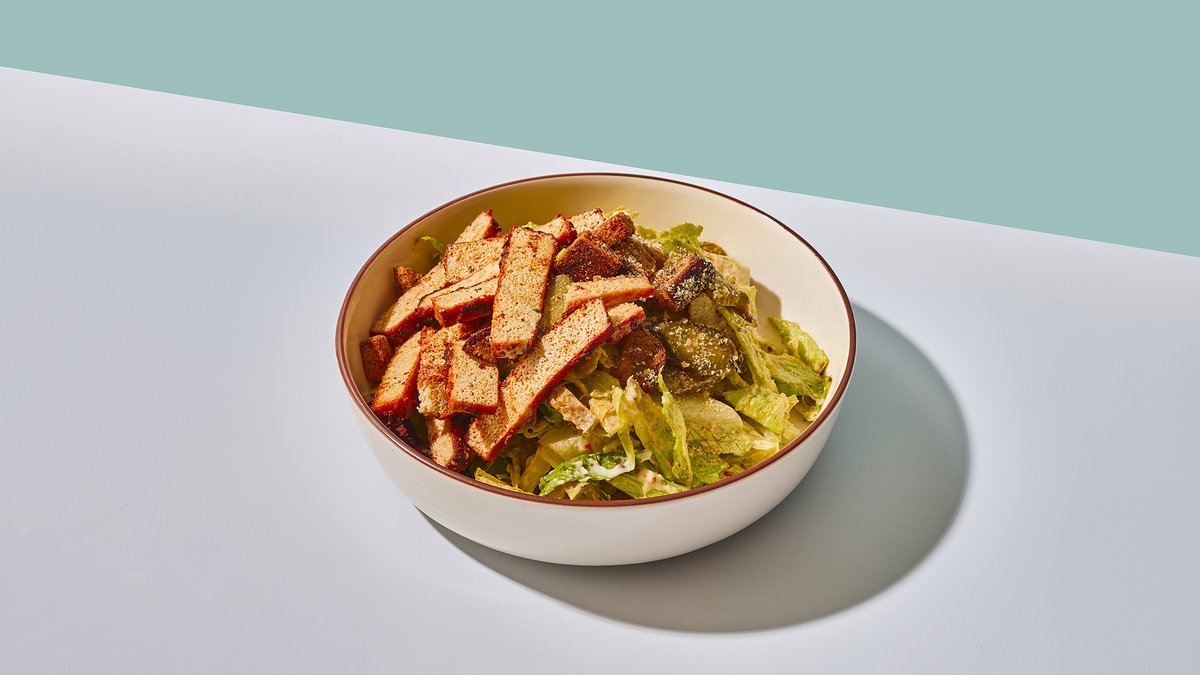 לבבות קיסר, קריספי טופו, ארטישוק צלוי, צלפים, חמוצים, קרוטונים ללא גלוטן, רוטב קיסר וגבינה בצד לבחירה