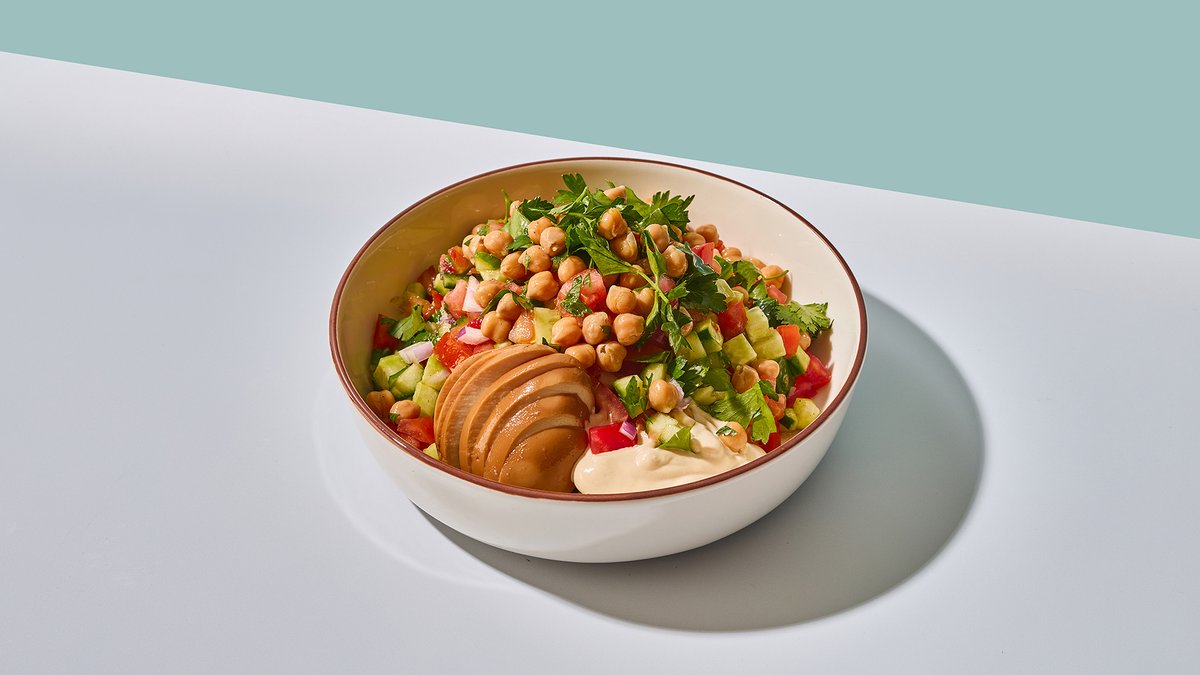 עגבניות, מלפפונים, בצל סגול ופטרוזיליה חתוכים דק דק עם גרגירי חומוס מבושלים, טחינה, ביצה חומה ושמן זית לימון לא ניתן לבצע שינויים במנה 🩵