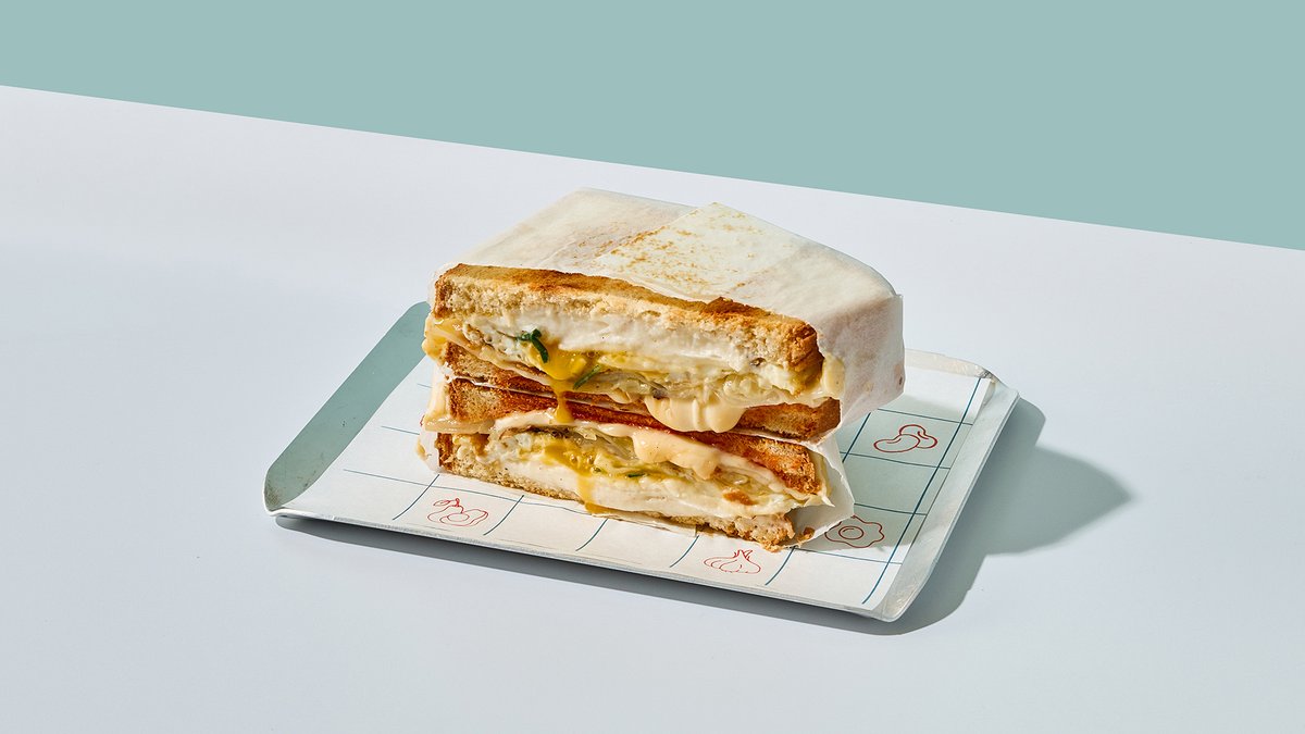 לחם קסטן עם שכבות של כרוב צלוי בחמאה ויין, בשמל, גבינת גאודה, עגבניות מיובשות וביצת עין רכה