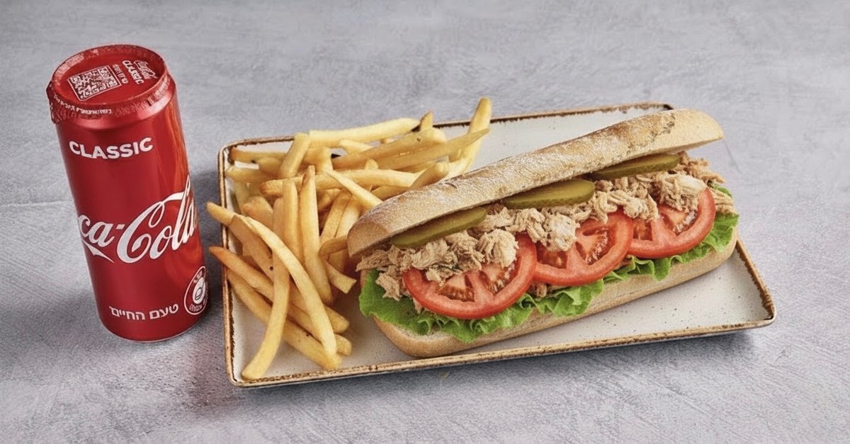 סנדוויץ לבחירה מוגש עם צ׳יפס קלאסי ושתייה