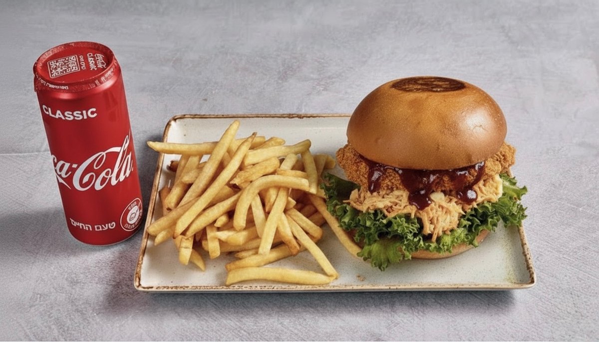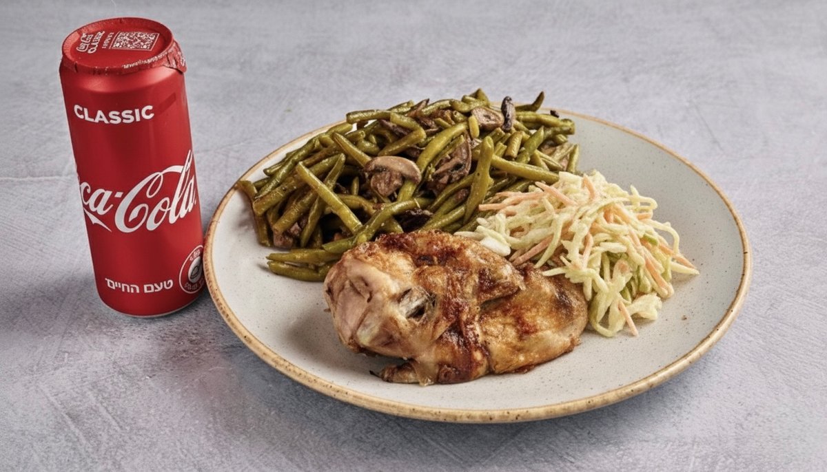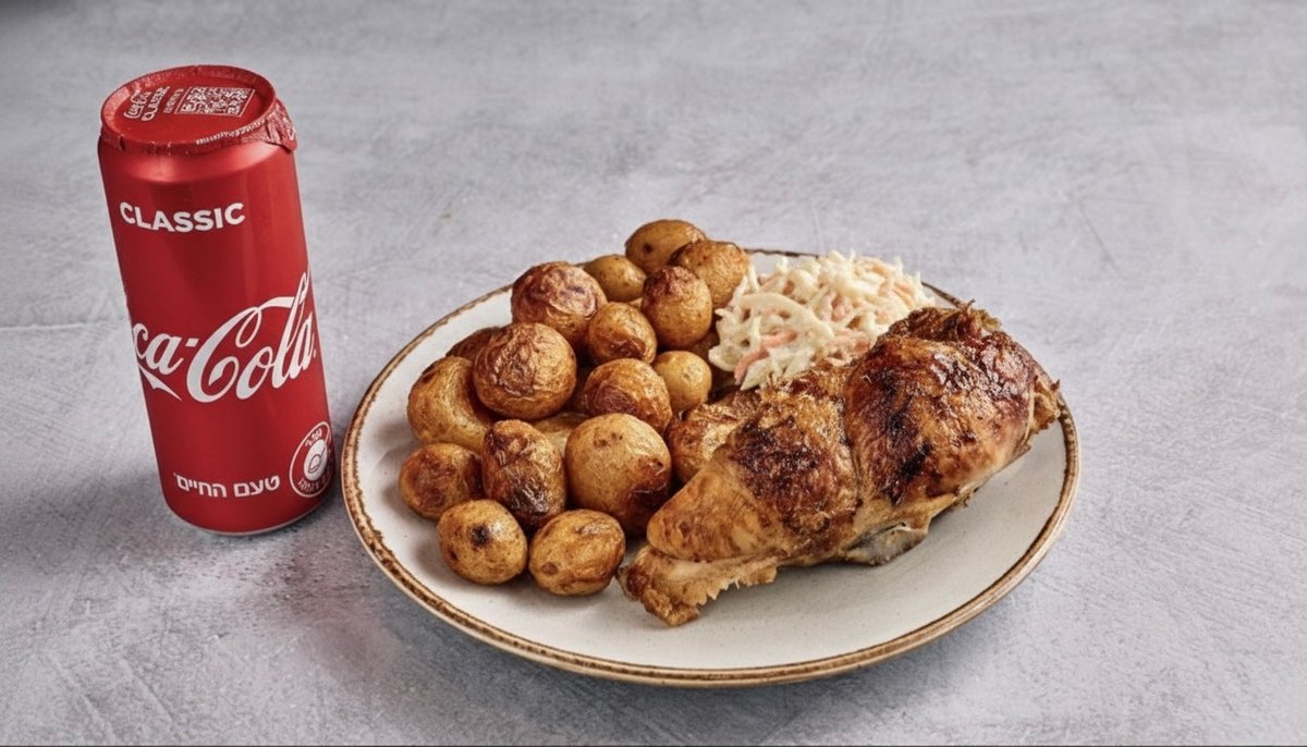 מוגש עם שתי תוספות ושני בקבוקי שתיה לבחירה וסלטון קולסלאו בצד