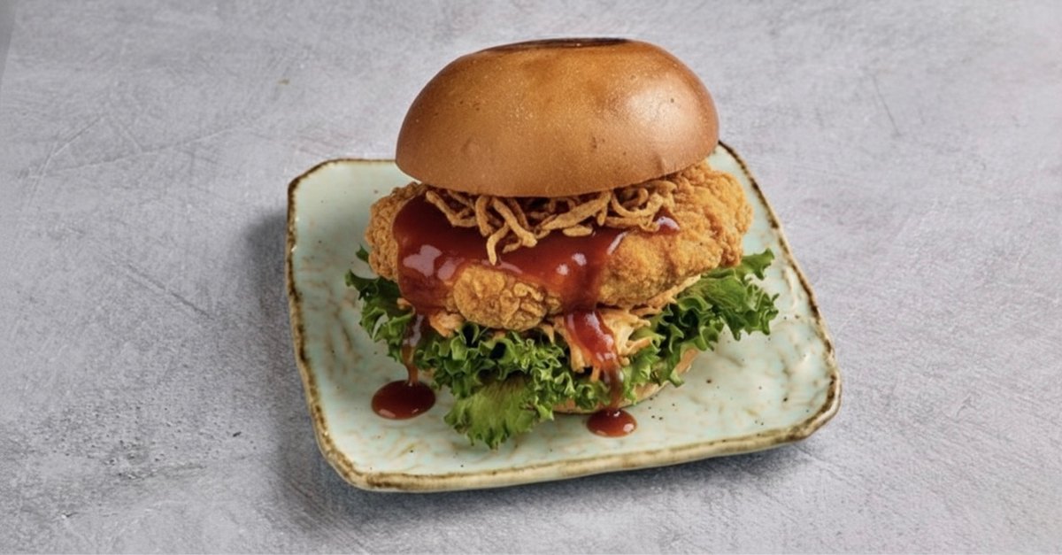 עוף קריספי, חסה, פיקלס, קולסלאו, בצל קריספי, רוטב ברביקיו