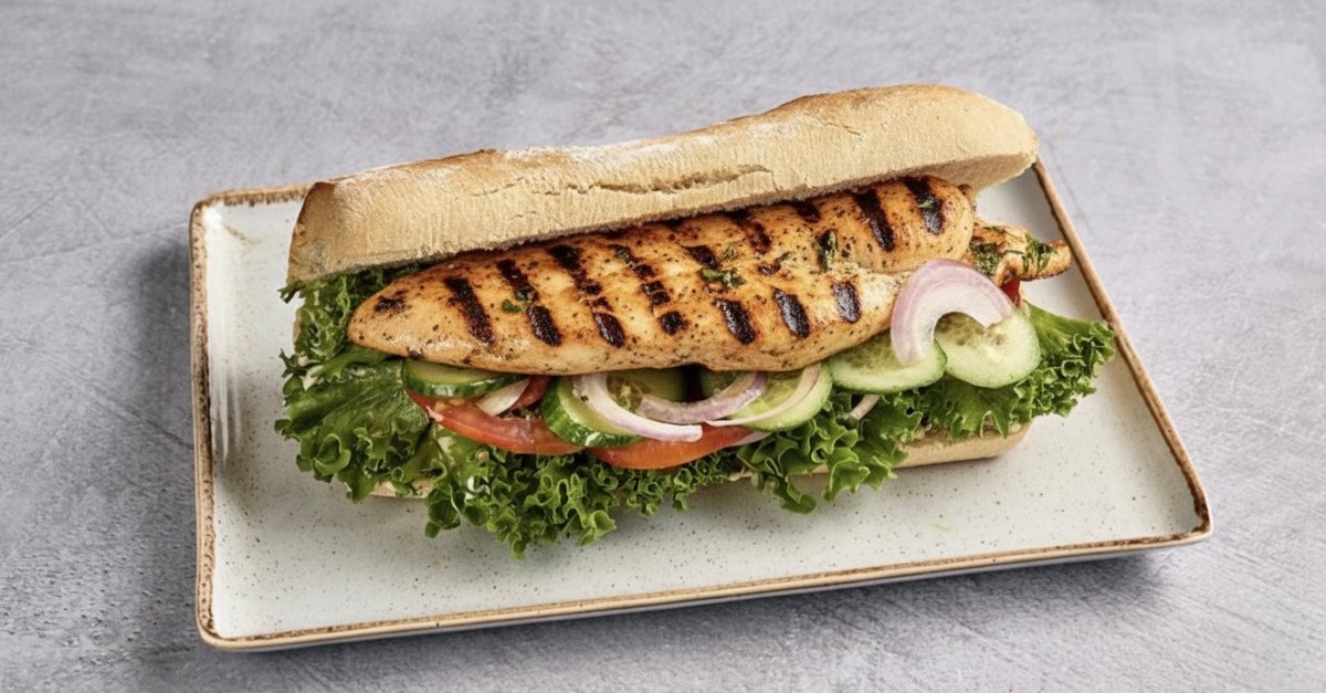 עוף בגריל מפורק, חסה, עגבניות, מלפפון חמוץ, מיונז