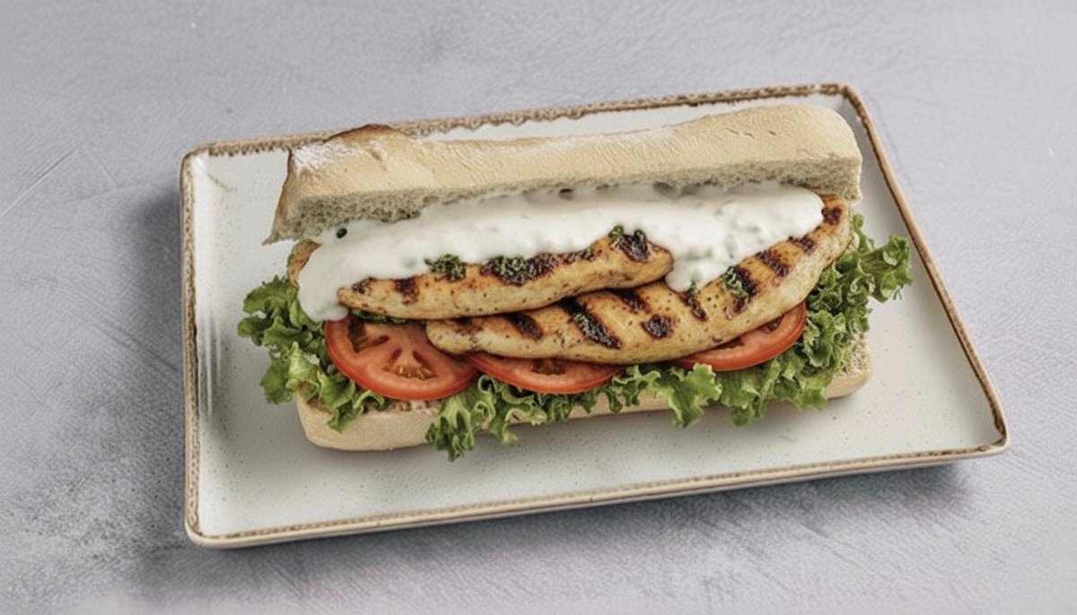 חזה עוף במרינדה, עגבניות, רוטב טרטר, חסה, גרידת לימון