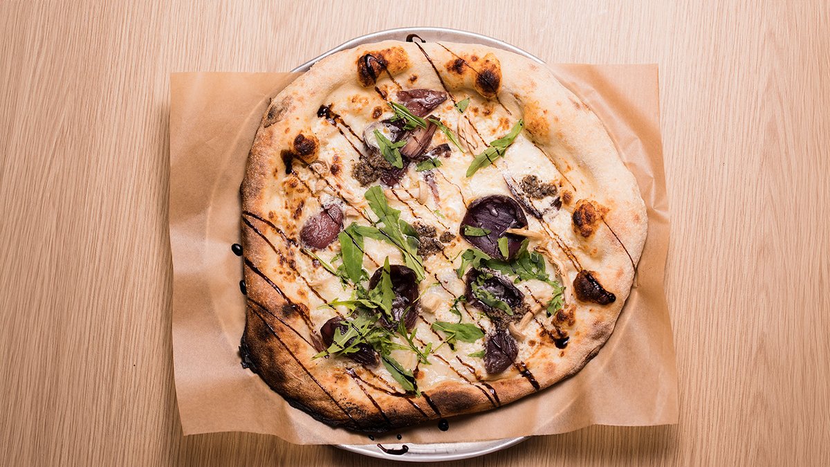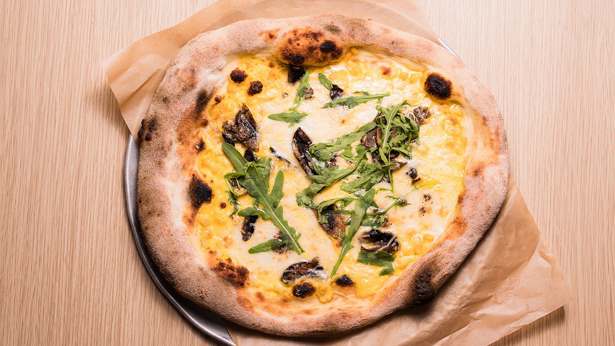 מוצרלה, רוטב 3 גבינות, פטריות שימג'י, פרמז'ן, שמן כמהין, עלי רוקט, בצל צלוי, עירית