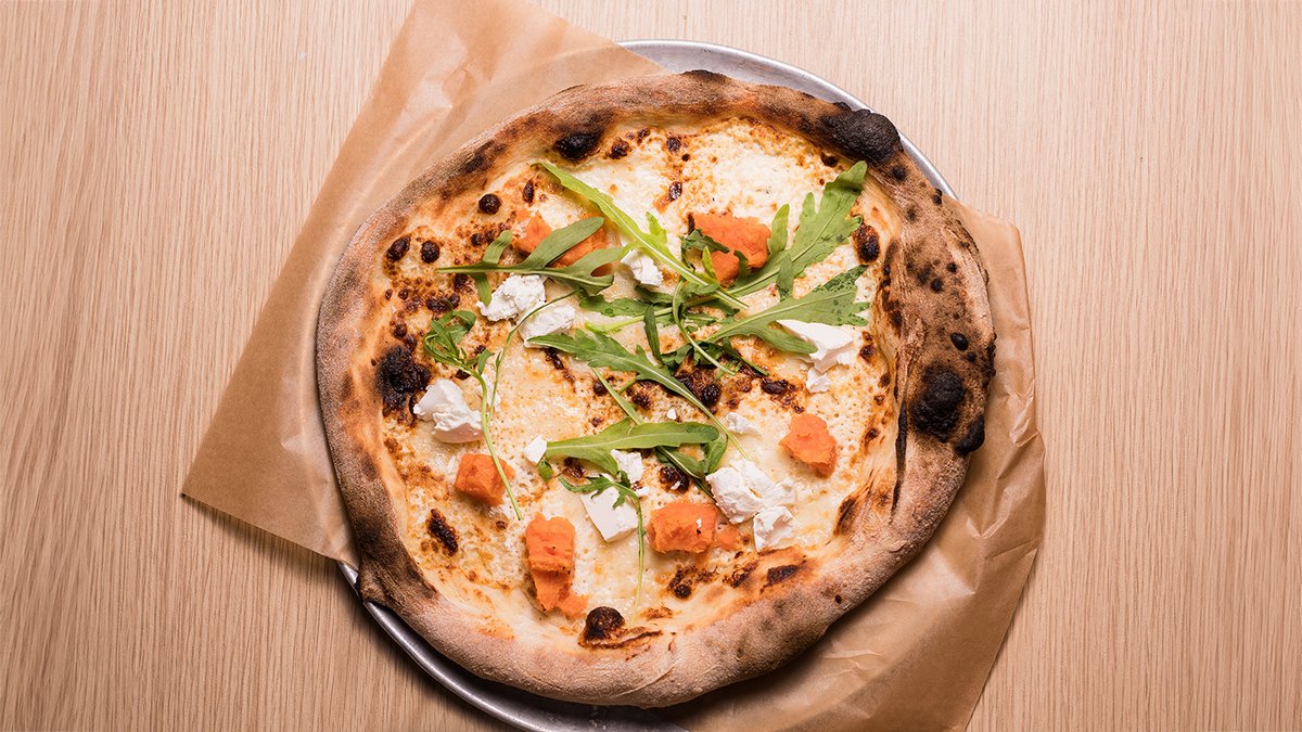מוצרלה, רוטב 3 גבינות, כרובית צלויה, טחינה, בצל ירוק, פלפל חריף, עלי רוקט