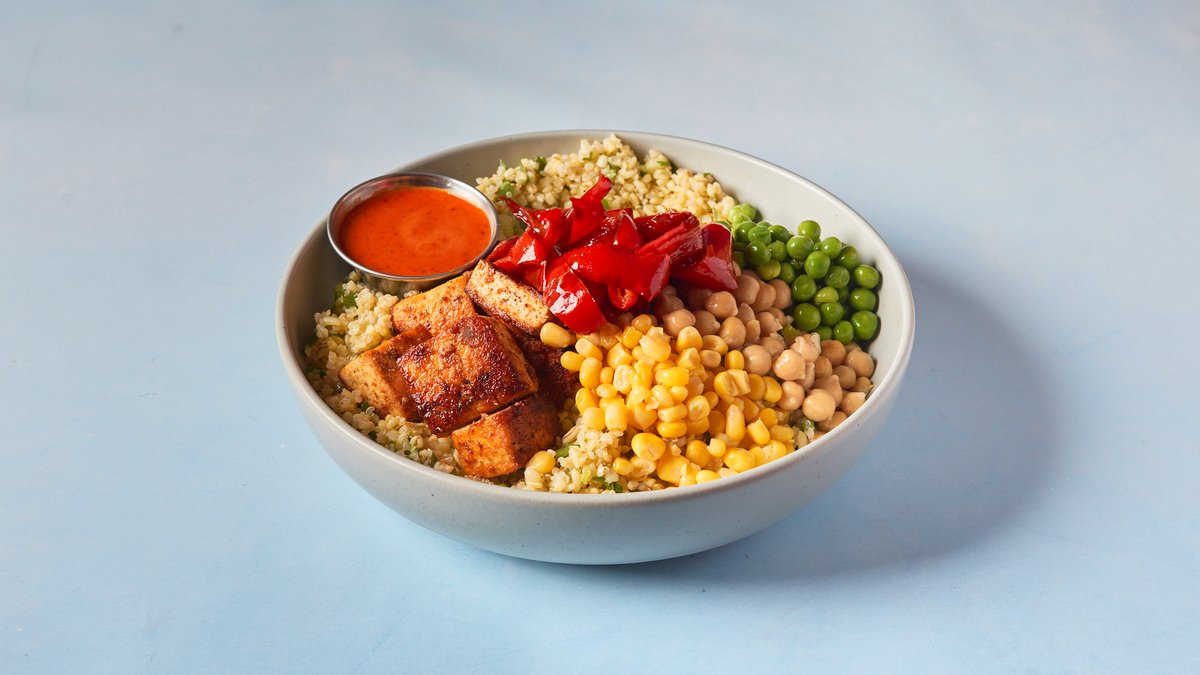 מיקס של קינואה ובורגול עם עשבי תיבול, חומוס, תירס וירק מתחלף