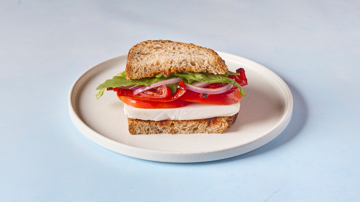 גבינת קשיו, ממרחב עגבניות מיובשות, פלפל קלוי, עגבניה, בצל סגול ואורוגולה בלחם דגנים