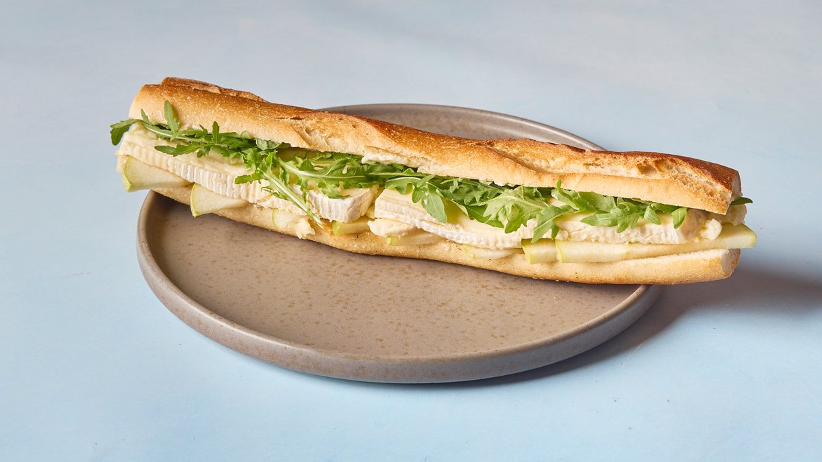 בגט פלוט צרפתי עם חמאה, ריבת בצל, אורוגולה, תפוח ירוק וגבינת ברי צרפתית