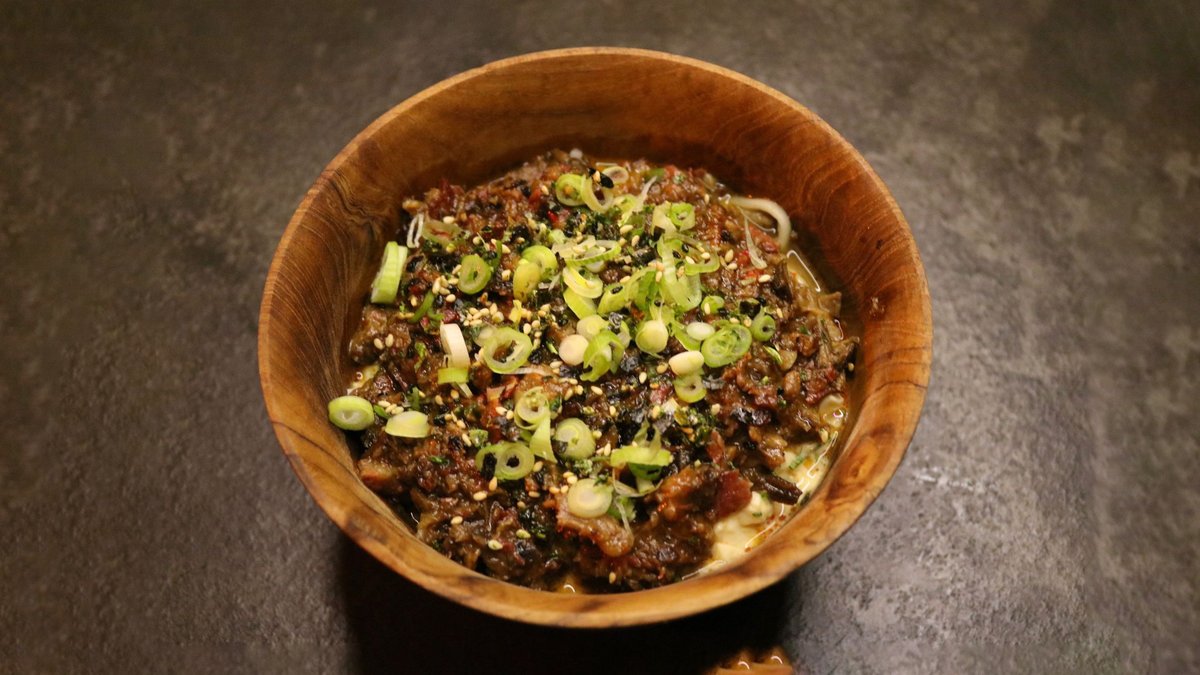 אטריות ראמן, בשר מפורק, סלט ביצים יפני, צ׳ילי, בצל ירוק וציר בקר ארומטי (המנה היא מנת איטריות ולא מרק) מכיל גלוטן ושומשום